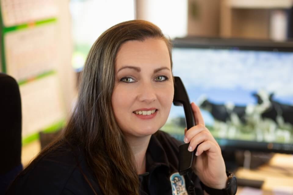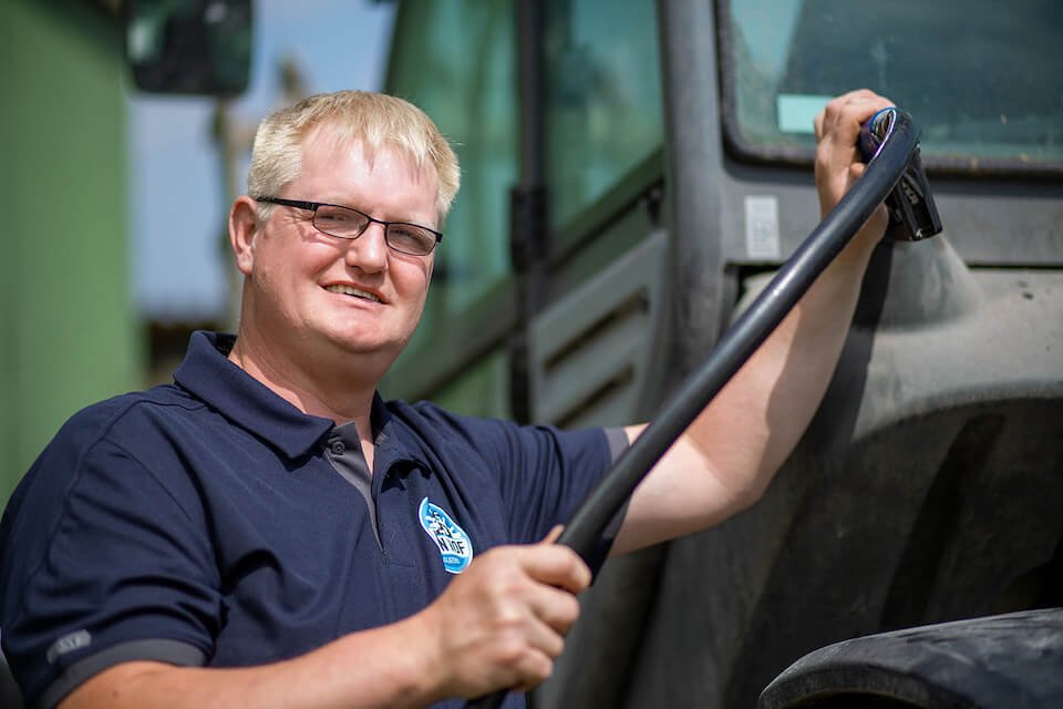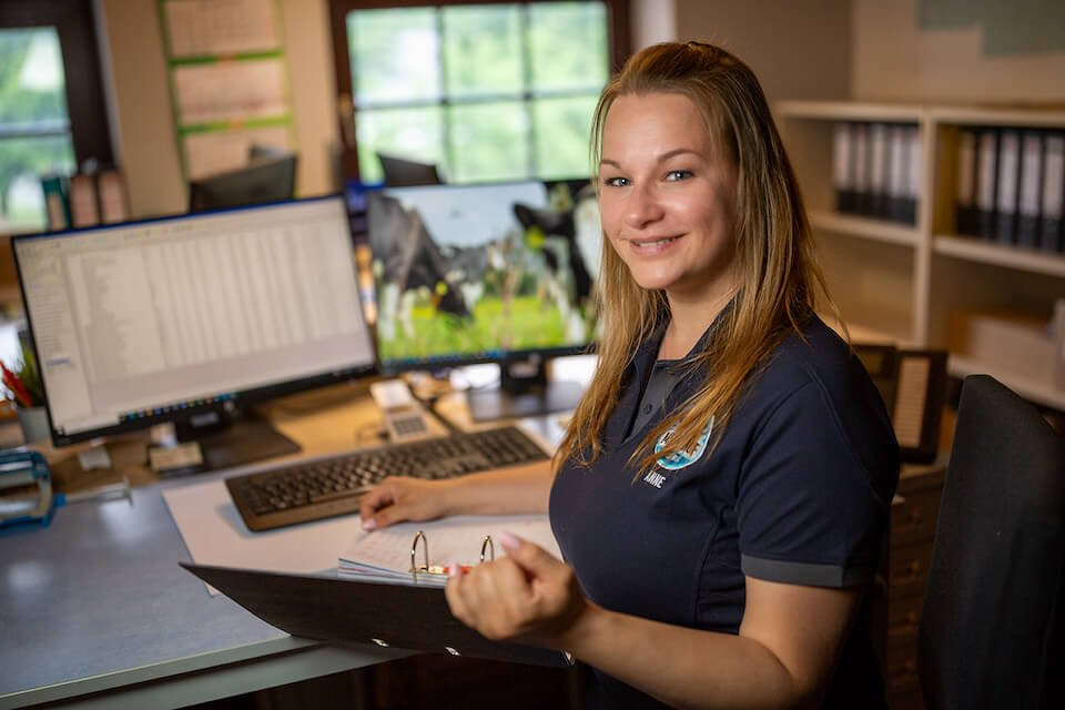 Zweimal täglich werden unsere Kühe vom Seniorchef persönlich in einem Doppel-6er-Fischgrätenmelkstand gemolken, immer zwölf Tiere auf ein Mal. Dabei gibt jede Kuh im Durchschnitt 30 Liter Milch pro Tag.