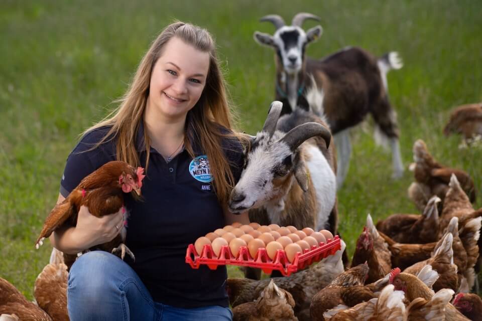 Unsere Hühner leben in 4 modernen Mobilställen und sind, natürlich mit unserer Hilfe, in der Lage den grünen Auslaufflächen immer hinterherzuziehen. Hühner sind tagaktiv, d.h. sie gehen mit der Dämmerung schlafen und sind so in ihrem Zuhause geschützt vor Fuchs und Habicht. Unsere 2 Zwergziegen Otto & Lotta sollen dies noch unterstützen. Bewegte Hühner legen etwa ein Ei am Tag - manchmal auch zwei :)